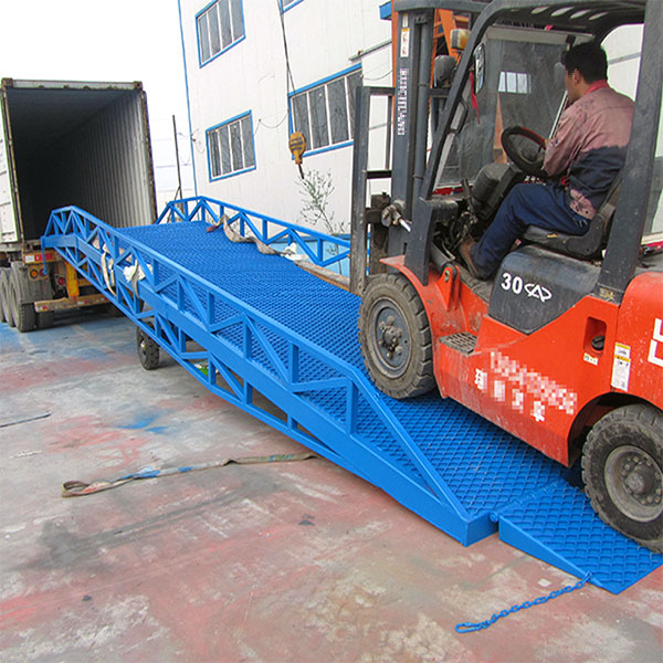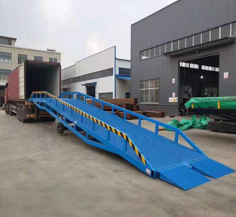移動登車橋是實現貨物快速裝卸的專用輔助設備,它的高度調節功能使貨車與庫房的貨臺之間架起一座橋梁,叉車等搬運車輛通過它能直接駛入貨車內部進行貨物的批量裝卸,僅需單人作業,即可實現貨物的快速裝卸。移動液壓登車橋使企業減少大量勞力,提高工作效率,獲取更大經濟效益。臺面均設計為網格狀鋼板,這種結構能保證具有很好的強度,又具有防滑功能,還能方便地清掃工作臺面,使它能經常地保持清潔、美觀。移動液壓登車橋無須外接電源,通過手搖泵做動力能輕松地在其整個調整范圍內按50mm的倍數進行高度的調整。可以充分適應各種不同高度的貨車.